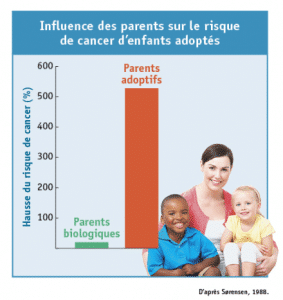 L’hérédité joue aussi un rôle beaucoup moins important qu’on peut le croire. En témoigne le risque de cancer d’enfants adoptés très tôt dans leur vie et dont l’un des parents biologiques ou adoptifs est décédé avant l’âge de 20 ans d’un cancer : la mortalité d’un parent adoptif est associée à une hausse très importante du risque de cancer chez ces enfants (500%), une proportion bien plus grande que si c’est un parent biologique qui a été touché par la maladie (20%).