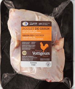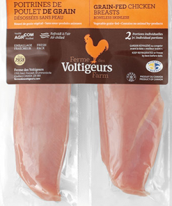 Ferme des Voltigeurs grain-fed chicken are given an all-vegetable feed, without animal by-products, right down to the vitamins they are given. Raised free-range on flooring, grain-fed chicken are housed in a space 20 à 30% larger than the average for the industry. The outcome is a tasty chicken, more flavorful, and of greater nutritional benefit. It also contains less fat than ordinary chicken.